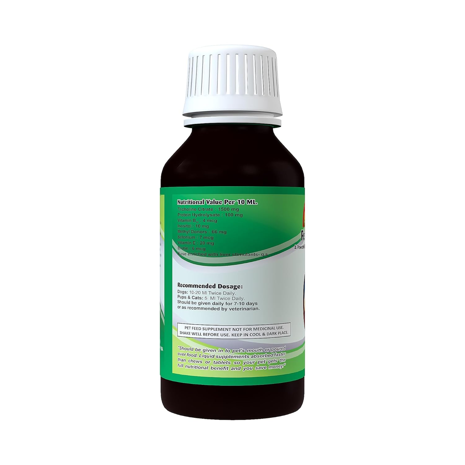 Composition of Petlive Forte: Each 10 ml contains Tricholine Citrate : 1500 mg Protein Hydrolysate : 100 mg Vitamin B 12 : 4 mcg Inositol : 10 mg Methyl Donors : 66 mg Selenium : 7 mcg Vitamin -E : 20 mg Biotin : 6 mcg Base enriched with liver stimulants- q.s. Dosages of Petlive Forte : Adult Dogs and Cats: 5 ml twice or thrice a day. Pups and Kittens: 2 ml twice or thrice a day. IMPORTANT NOTE: Mix supplements with your pets’ favourite foods to make it easier for them to take supplements.