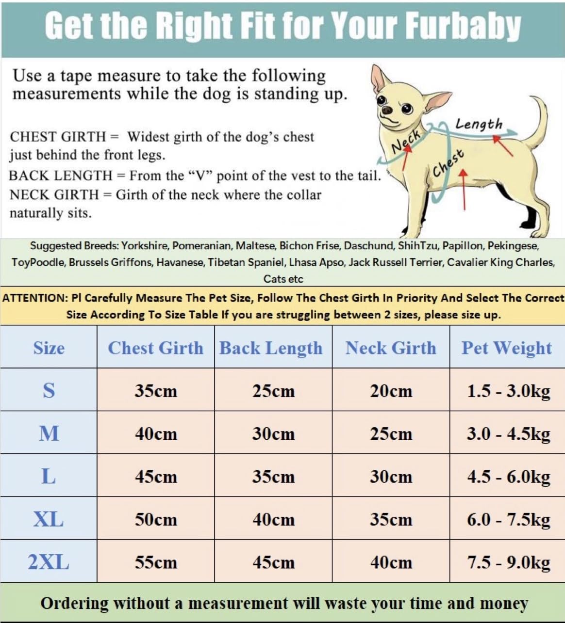 • WARM TIPS: Please carefully check the size chart in the picture. Pl do measure your pet before purchasing. If your dog measurements are between 2 sizes, we suggest you order the larger size. SIZE:M:- Chest:40cm, Back:30cm & Neck:25cm. This fashion pet clothes fits small dogs: Chihuahua / Pomeranian / Pugs / Maltese / Shih Tzu /Toy Poodle / Miniature poodle / Mini dachshund / Boston terrier puppy / Yorkie / French bulldog puppy, Papillon/ Bichon /King Charls. REMEMBER: ONLY FOR SMALL BREED DOGS.