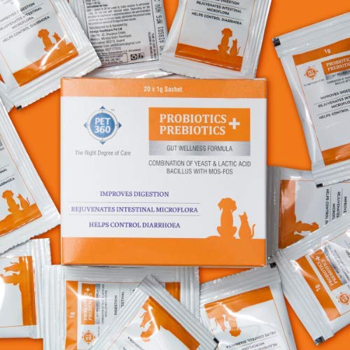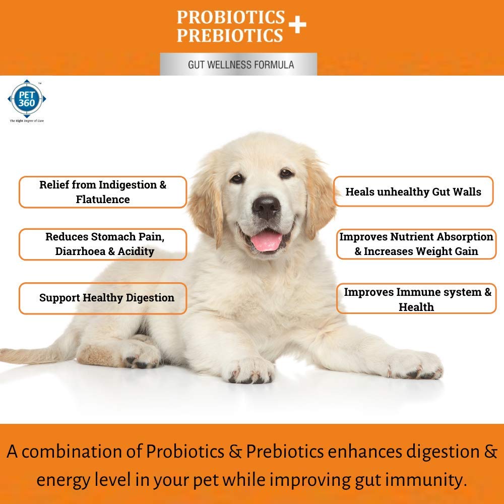 - OPTIMAL GUT HEALTH FOR PETS: Ensure your pet’s digestive health with PET360 PROBIOTICS + PREBIOTICS Gut Wellness Formula. It contains a unique combination of yeast, Lactic Acid Bacillus, MOS, FOS & Zinc lactate. This pet supplement helps in improved digestion, reduced incidences of diarrhoea & enhanced gut immunity.