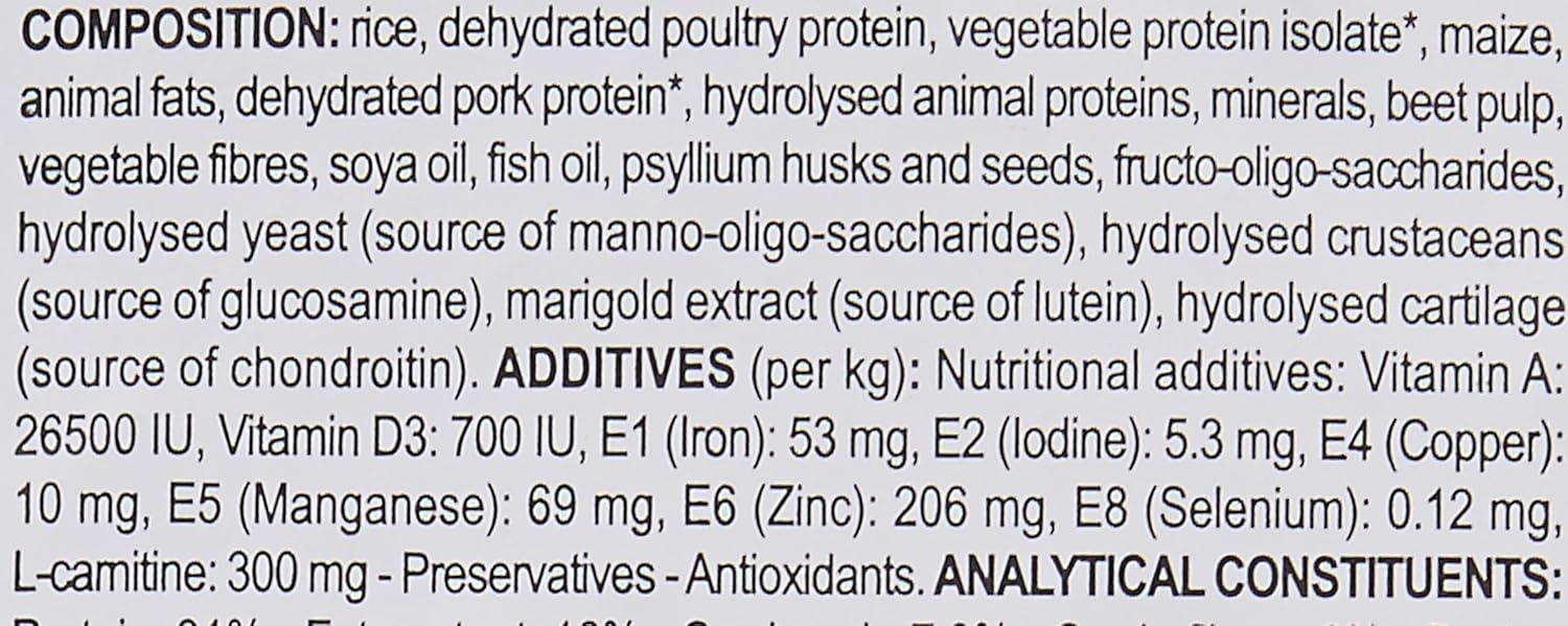rice, dehydrated poultry protein, vegetable protein isolate*, maize, animal fats, dehydrated pork protein*, hydrolysed animal proteins, minerals, beet pulp, vegetable fibres, soya oil, fish oil, psyllium husks and seeds, fructo-oligo-saccharides, hydrolysed yeast (source of manno-oligo-saccharides), hydrolysed crustaceans (source of glucosamine), marigold extract (source of lutein), hydrolysed cartilage (source of chondroitin). ADDITIVES (per kg): Nutritional additives: Vitamin A: 26500 IU, Vitamin D3: 700 IU, El (Iron): 53 mg, E2 (Iodine): 5.3 mg, E4 (Copper): 10 mg, E5 (Manganese): 69 mg, E6 (Zinc): 206 mg, E8 (Selenium): 0.12 mg, L-camitine: 300 mg – Preservatives -Antioxidants