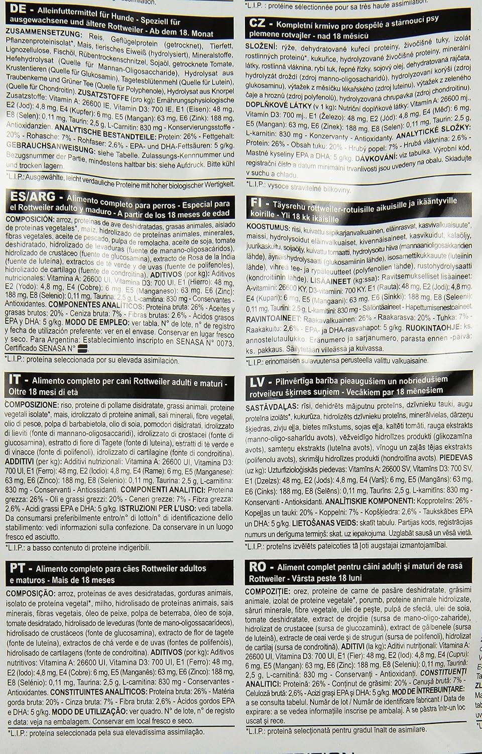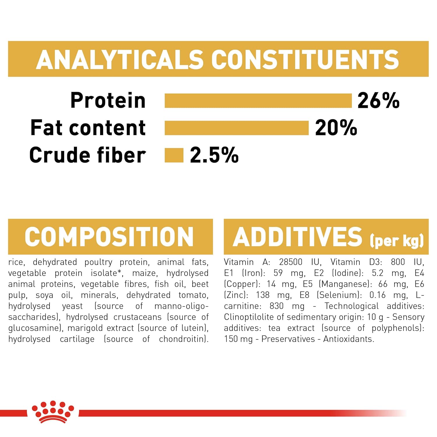 COMPOSITION: rice, dehydrated poultry protein, animal fats, vegetable protein isolate*, maize, hydrolysed animal proteins, minerals, vegetable fibres, fish oil, beet pulp, soya oil, dehydrated tomato, hydrolysed yeast (source of manno-oligosaccharides), hydrolysed crustaceans (source of glucosamine), marigold extract (source of lutein), green tea and grape extracts (source of polyphenols), hydrolysed cartilage (source of chondroitin). ADDITIVES (per kg): Nutritional additives: Vitamin A: 26600 IU, Vitamin D3: 700 IU, E1 (Iron): 48 mg, E2 (Iodine): 4.8 mg, E4 (Copper): 6 mg, E5 (Manganese): 63 mg, E6 (Zinc): 188 mg, E8 (Selenium): 0.11 mg, Taurine: 2.5 g, L-carnitine: 830 mg – Preservatives – Antioxidants. ANALYTICAL CONSTITUENTS: Protein: 26% – Fat content: 20% – Crude ash: 7% – Crude fibres: 2.6% – EPA and DHA fatty acids: 5 g/kg.