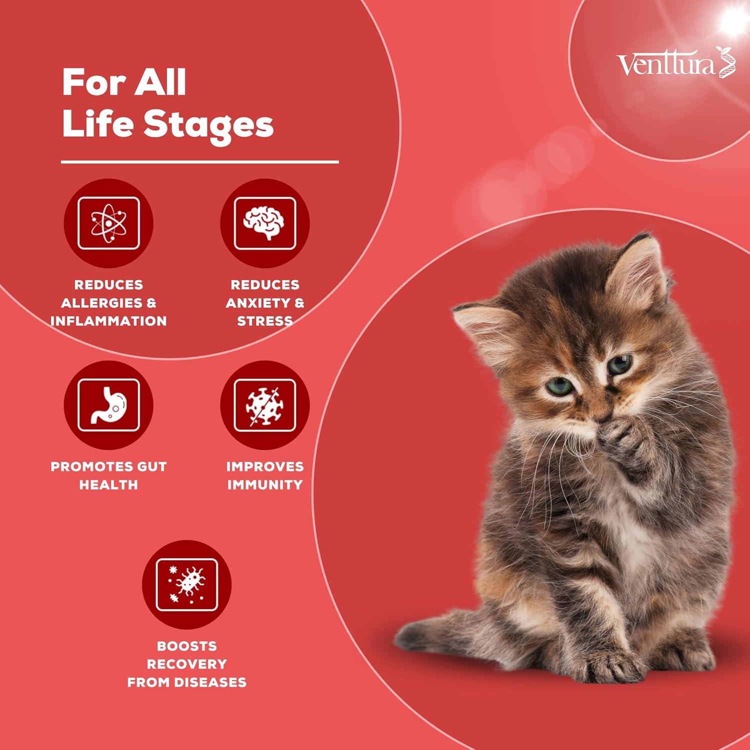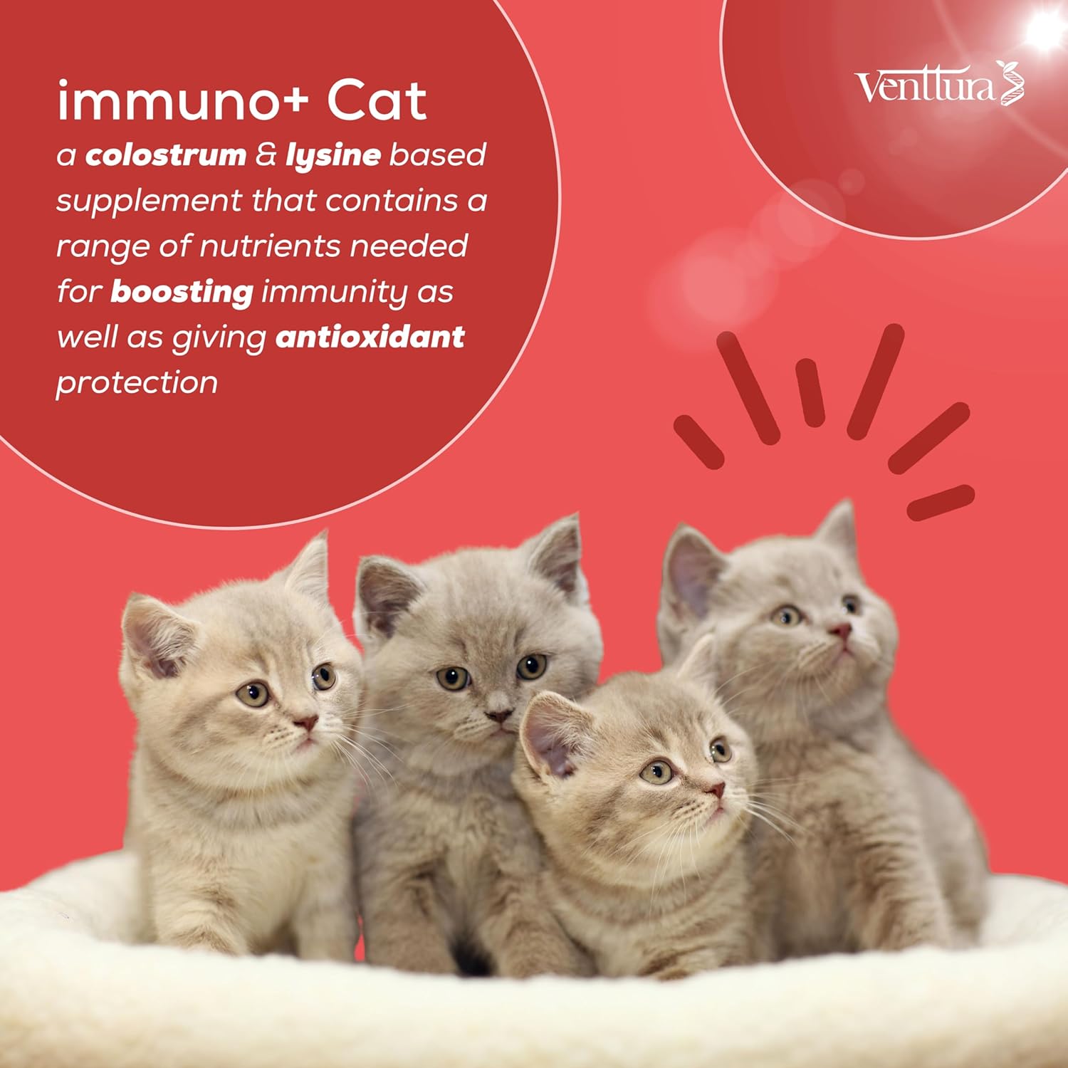 - Venttura Immuno+ Cat boosts immunity and overall health with colostrum, lysine, vitamins, and antioxidants, promoting calmness and a balanced mood for a happy kitty.