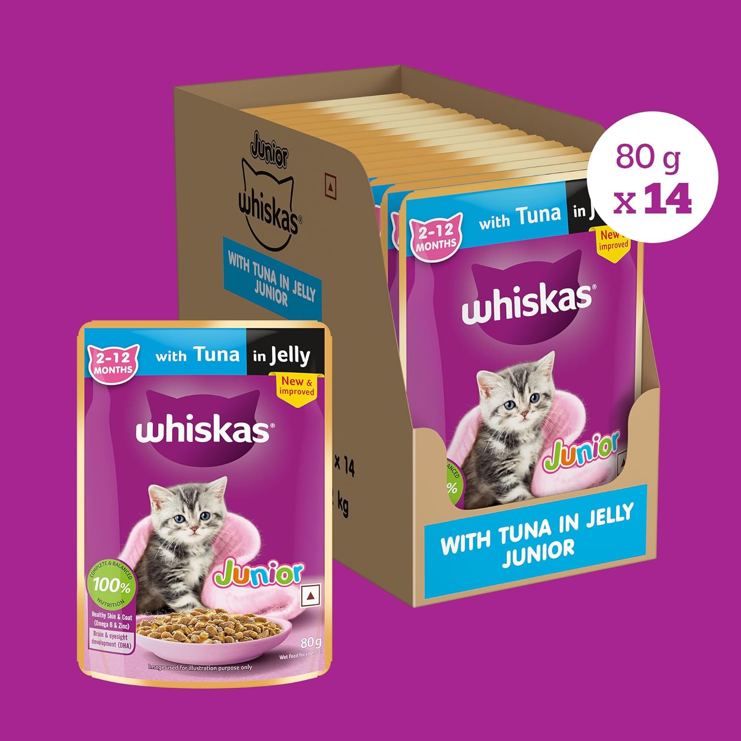 - DELICIOUS FLAVOUR: Whiskas Junior Wet Cat Food, Tuna in Jelly, contains a jelly texture and aroma that appeal to the palate of your feline.